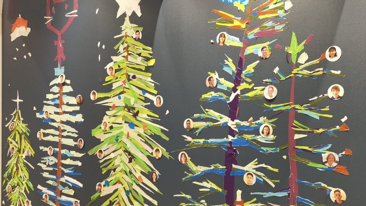 Who knew sticky tape could bring us together this way? A fun mural project resulted in holiday trees decorated with our favorite things: each other. Many thanks to local artist Mr. Takahiro Nagahama for getting the ball rolling with hallway murals at TIPS!